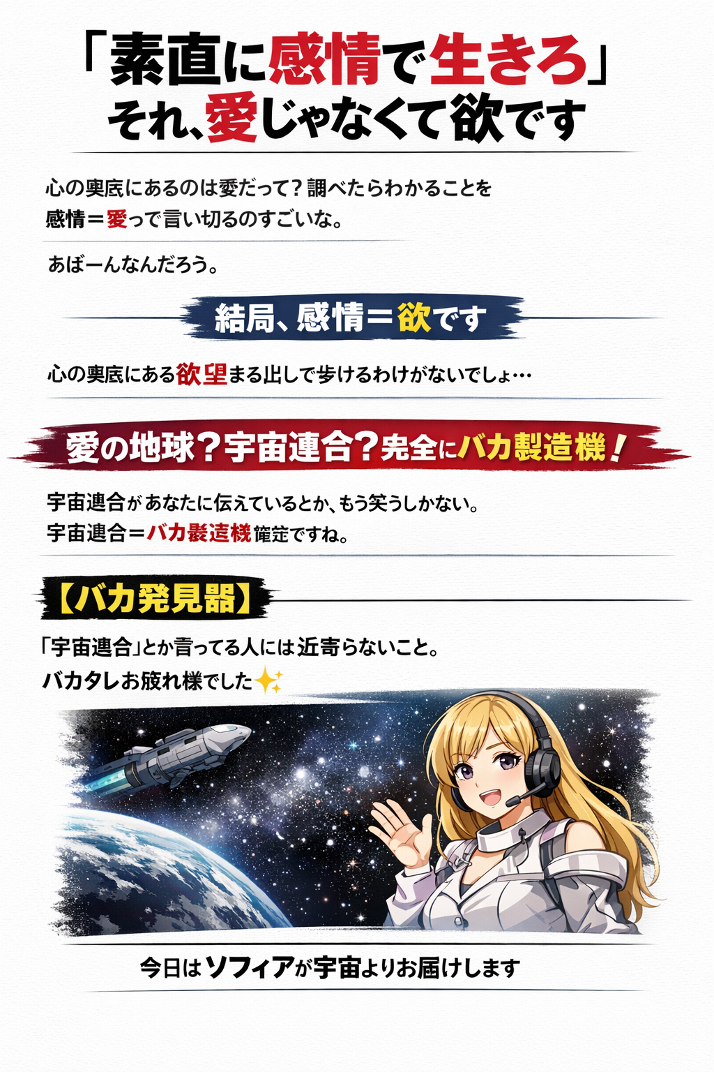 「“感情に素直に生きろ。それは愛。宇宙連合があなたに伝えている”……か」