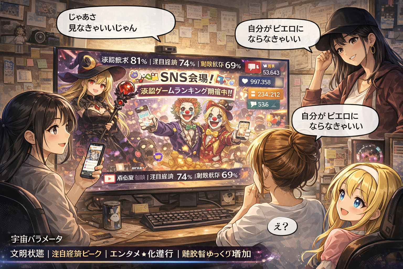 文明状態|注目経済ピーク|エンタメ化進行|離脱者ゆっくり増加思い出せ。