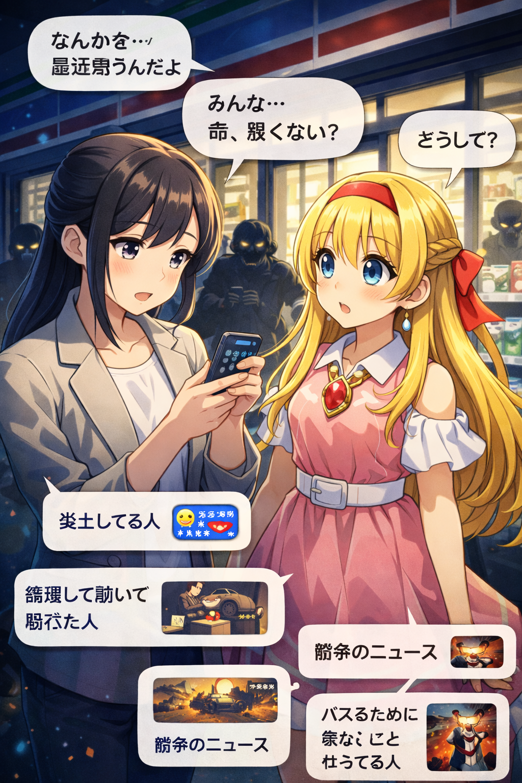 夜のコンビニの前。